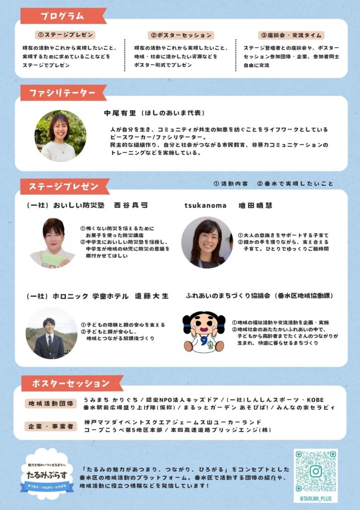 「たるみっけ!」は、「地域・社会貢献活動の幅を広げたい」「自社や個人の資源を地域に活かしたい」という想いを持つ個人・団体・企業がつながる交流イベントです。昨年は80を超える団体が参加し、新たな協働やプロジェクトが多数生まれました。